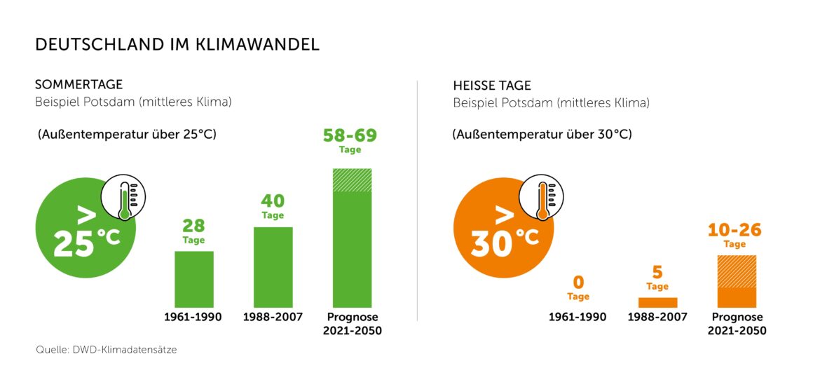 Bereits heute macht sich der Klimawandel in Deutschland deutlich bemerkbar: Laut Daten des Deutschen Wetterdienstes DWD stieg in mittleren Klimaregionen wie bspw. Potsdam das Thermometer zwischen 1961 und 1990 an im Schnitt 28 Tagen im Jahr über die 25-Grad-Marke. Bis 2007 waren es schon 40 Tage, in den kommenden Jahrzehnten werden es 58 bis 69 Tage werden. Auch die heißen Tage mit Temperaturen über 30 Grad werden deutlich zunehmen. “Auf diese Entwicklung ist unser Gebäudebestand nicht vorbereitet. Viele Gebäude werden im Sommer zunehmend überhitzen”, warnt der Bauphysiker Dr. Stephan Schlitzberger vom Ingenieurbüro Hauser (IBH). Er hat in einer aktuellen Studie simuliert, wie übliche Wohnräume auf die zukünftige Klimaerwärmung reagieren – und wie man eine Überhitzung wirkungsvoll auch ohne Klimatisierung verhindern kann. “Da die Norm-Vorgaben für den Sonnenschutz noch auf Klimadaten von 1988 bis 2007 basieren, sind selbst heutige Neubauten oft nicht einmal fit für die gegenwärtigen Sommer, erst recht nicht für die Sommer der Zukunft”, erläutert der Studien-Autor. “In Deutschland wird in punkto Hitzeschutz für das Klima der Vergangenheit gebaut. Für Sanierungen gibt es gar keine gesetzlichen Anforderungen an den sommerlichen Wärmeschutz. Das müssen wir ändern.”